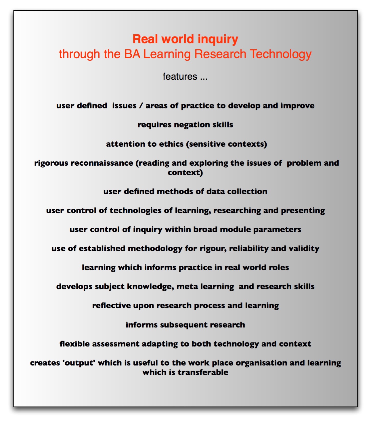 From this exploration comes a descriptive list of the characteristics of PBL based around a real world inquiry approach.