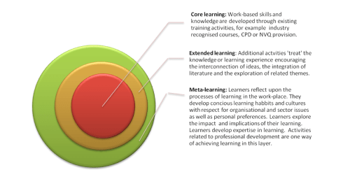 One of the curriculum tools under early usage at the moment is a wrapper module. Now in operation these modules enable higher level learning to wrap around work-based training. Through extensions of various sorts the core learning can be escalated and deepened. The following diagram tries to conceptualise this for a forthcoming publication (click to view) :