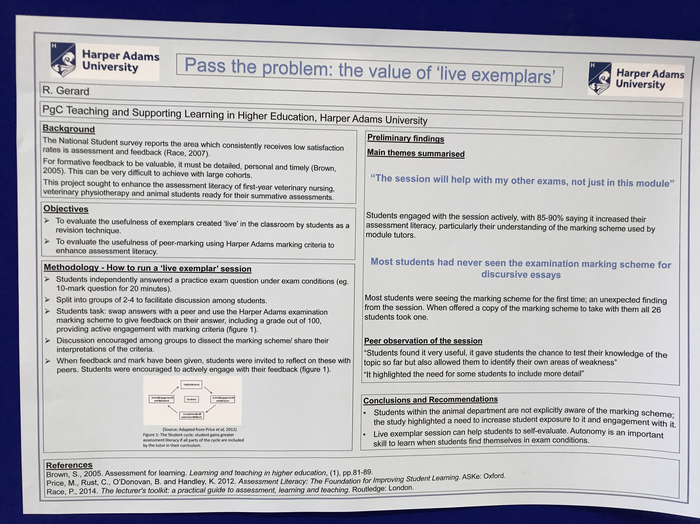 Rebekah Gerard’s poster was a great complement to Kay’s session. Bex shows how we can really use live exemplars in a workshop session to improve exam technique. She used a technique called ‘pass the problem’ and her PgC action research showed how students experienced this strategy. Her poster shows the technique she used for ease of replicability: