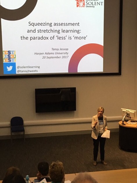 Professor Tansy Jessop started off by inspiring a ‘nuclear climb down’ on assessment, where together teaching staff agree to summatively assess less. The shift away from too much summative assessment, Tansy reminded us, only succeeds if we collectively mean it. If some tutors are stealthily continuing to over-assess, then inevitably students will direct their attention to these activities at the expense of others. She talked about relinquishing assessment driven pedagogies of control, to a curriculum driven more by learning.