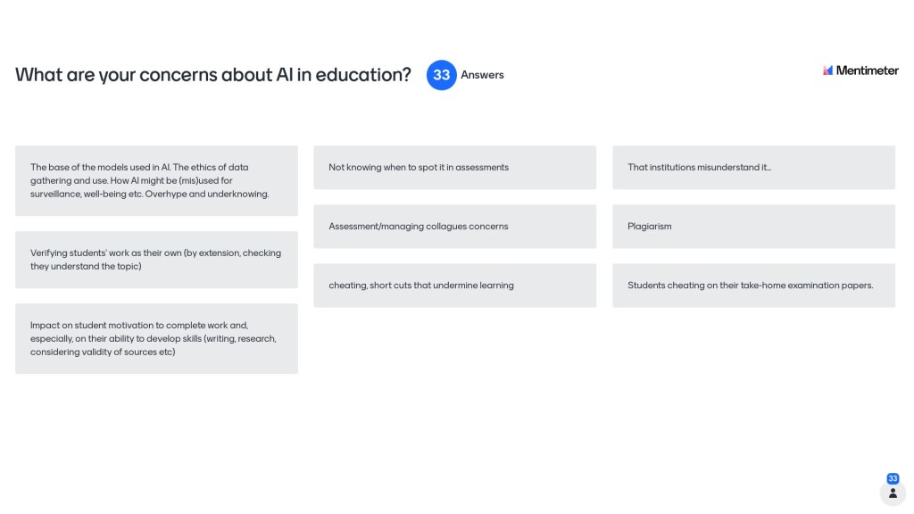 Within the session, we looked at our own reactions to AI (are we using it?); we considered our community response and the policy response of institutions.