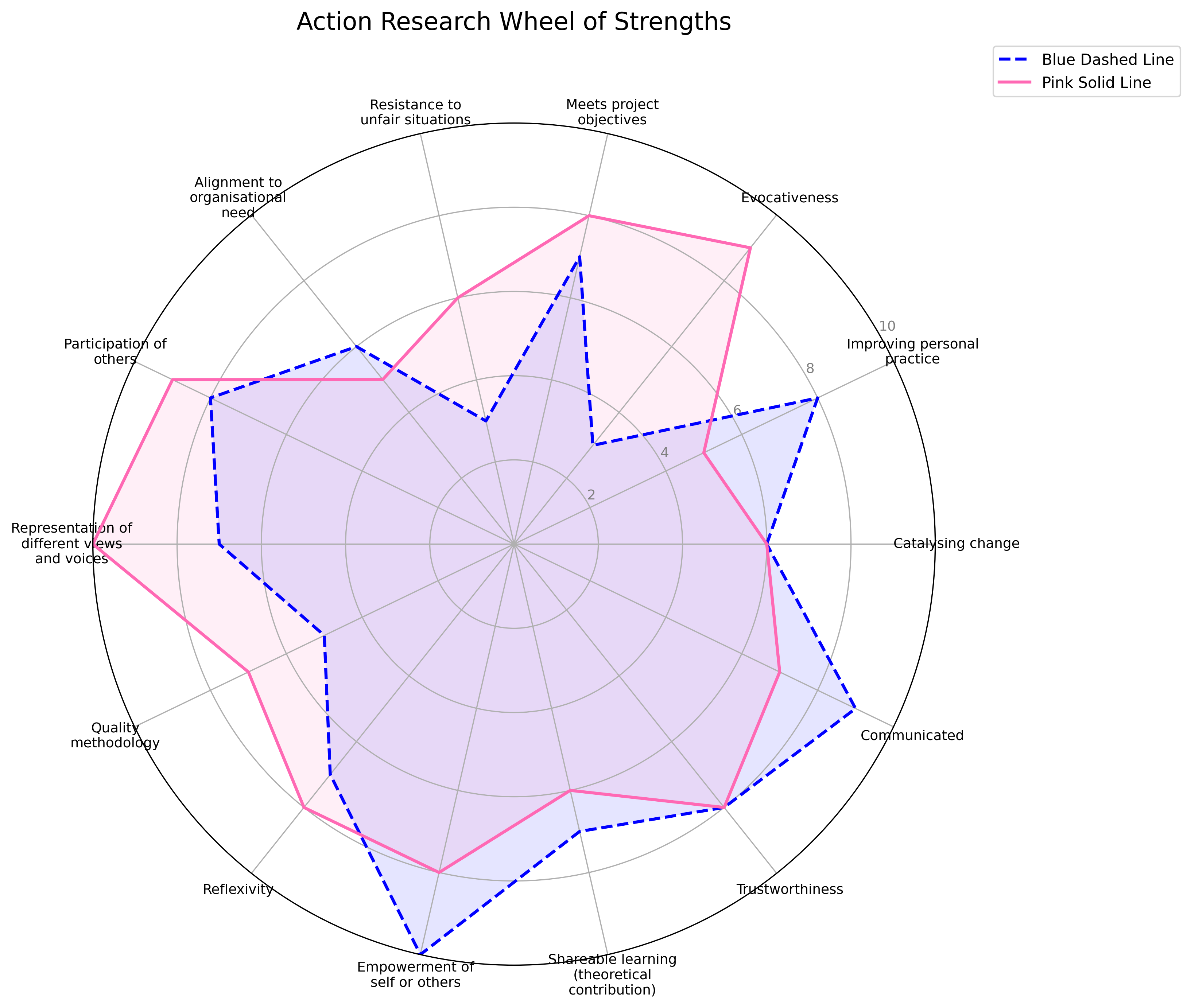 The completed chart below shows an example of two different (imaginary) pieces of Pedagogic Action Research. Neither is better than the other – they are simply different. For the pink (solid) line I brought to mind a project which is about story-telling – capturing different voices of a type of student experience to foreground challenges and diverse experiences – such a project may simply be called Experiences of being a politics student in times of change. The blue line represents a different type of project where an intervention is made to introduce professional development on the topic of active learning; the intervention creates change and builds momentum for discussion around engaging teaching and develops broadly sharable lessons which may be useful to others. These two fictitious examples seek to highlight the quality profiles that different types of projects will have.