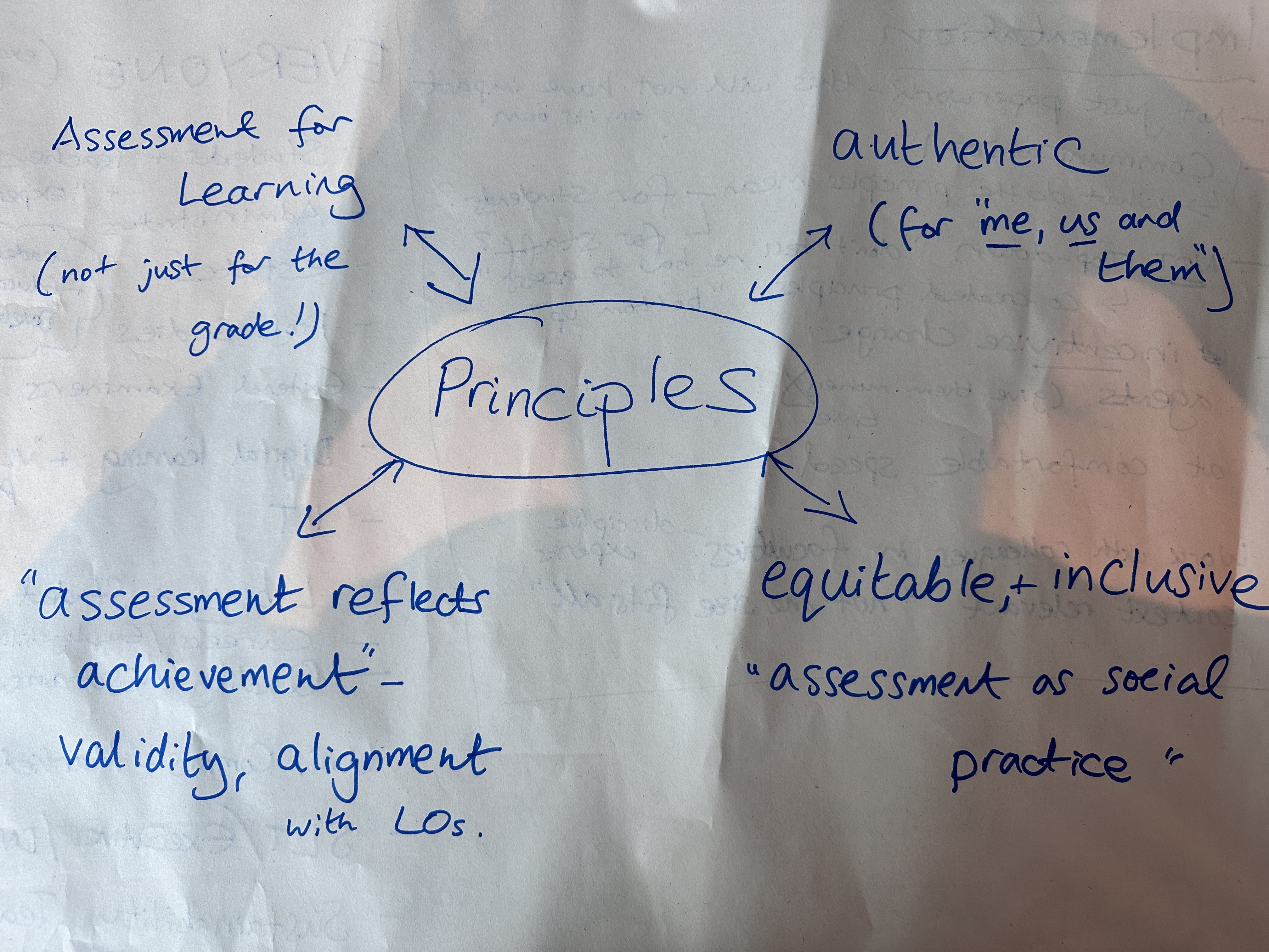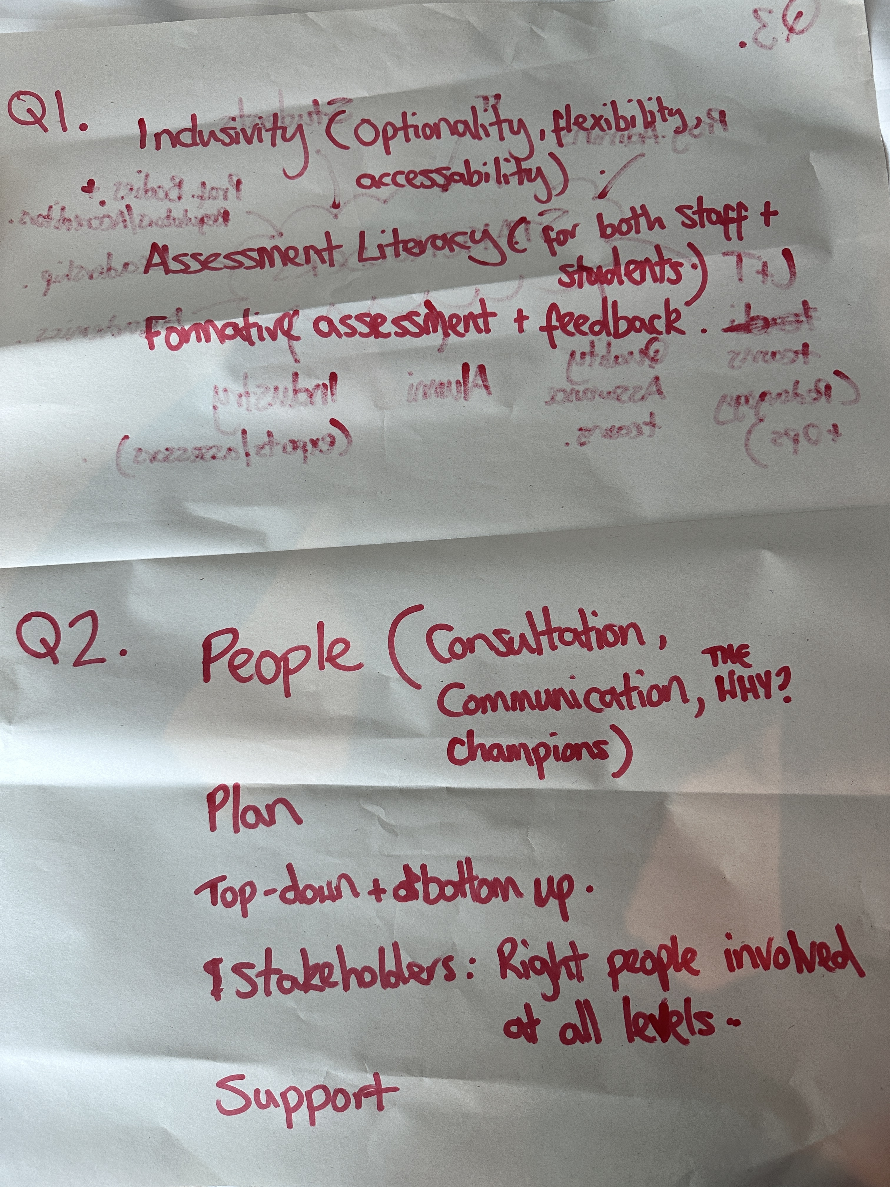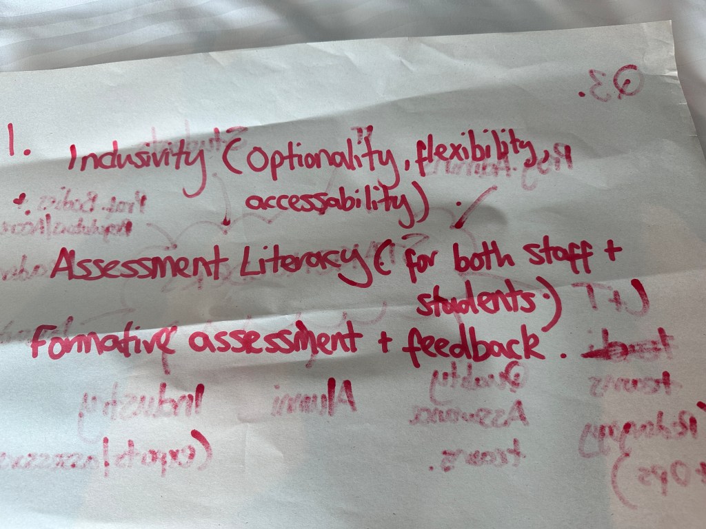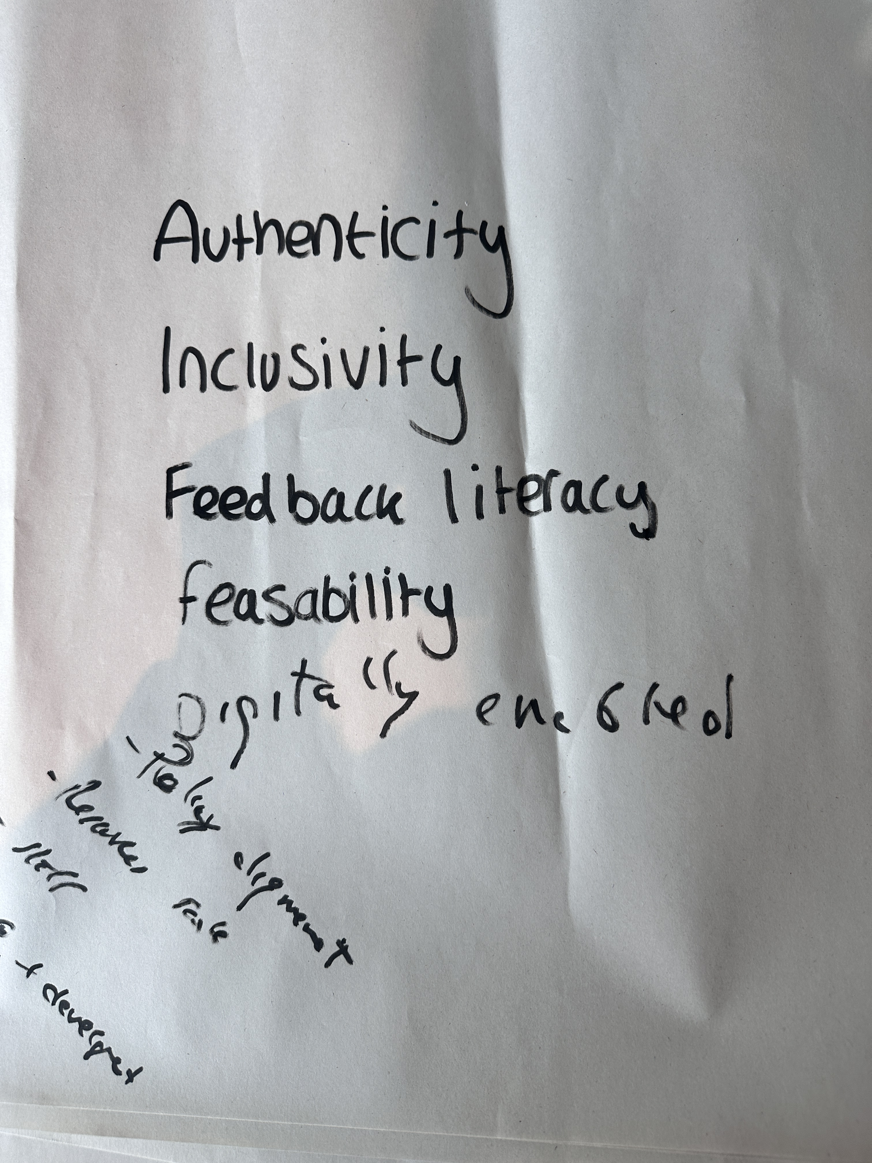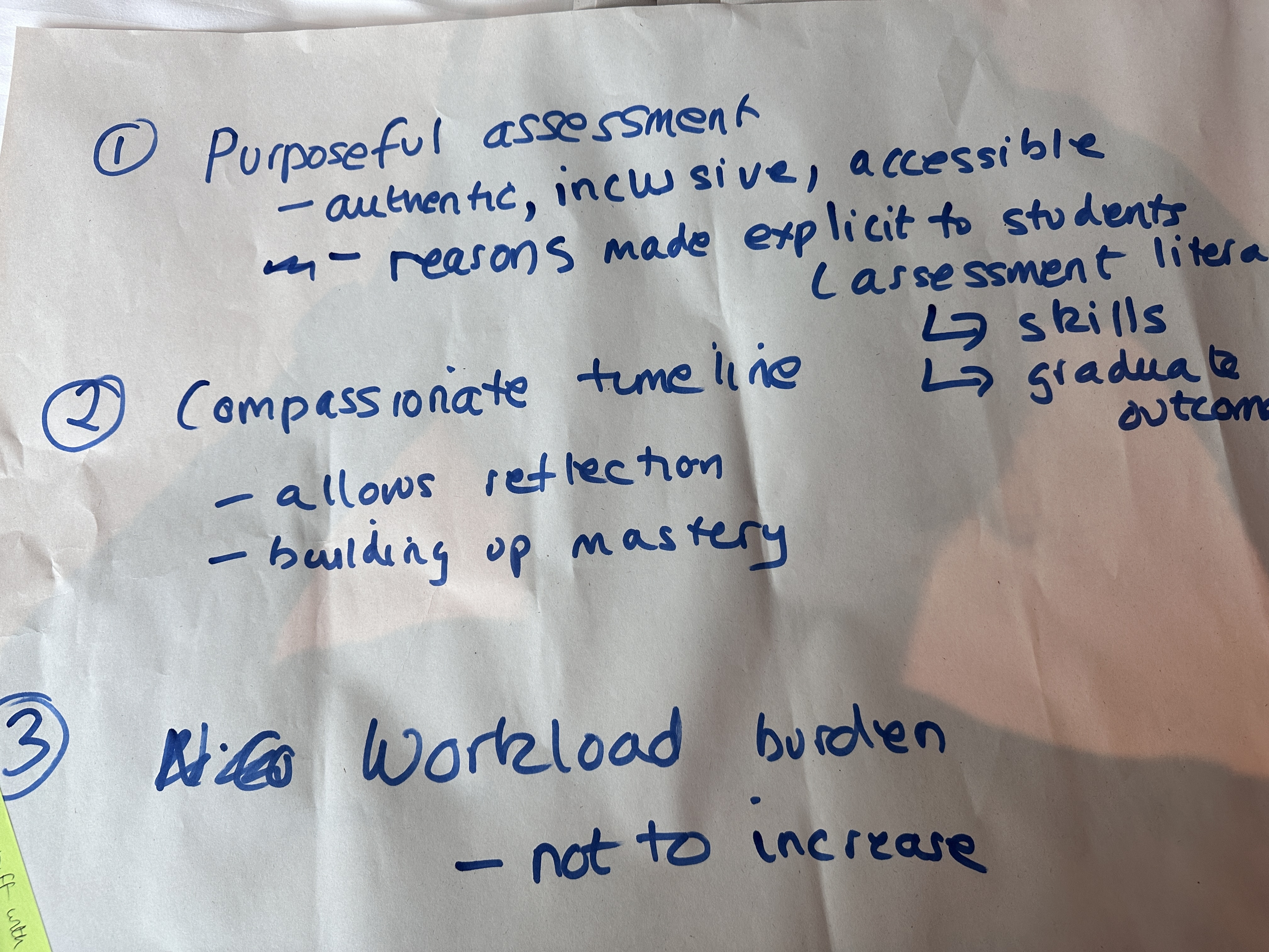 We did have a range of answers recorded on the flip charts, including: programme design, co-design, clear purpose, consideration of well-being, purposeful assessment, compassionate, equitable, aligned, valid, reflective of achievement (discriminating), formative, focus on process over product, digitally enabled, GenAI-conscious, and diverse approaches for diverse students (pictures of the materials left in the room are below).