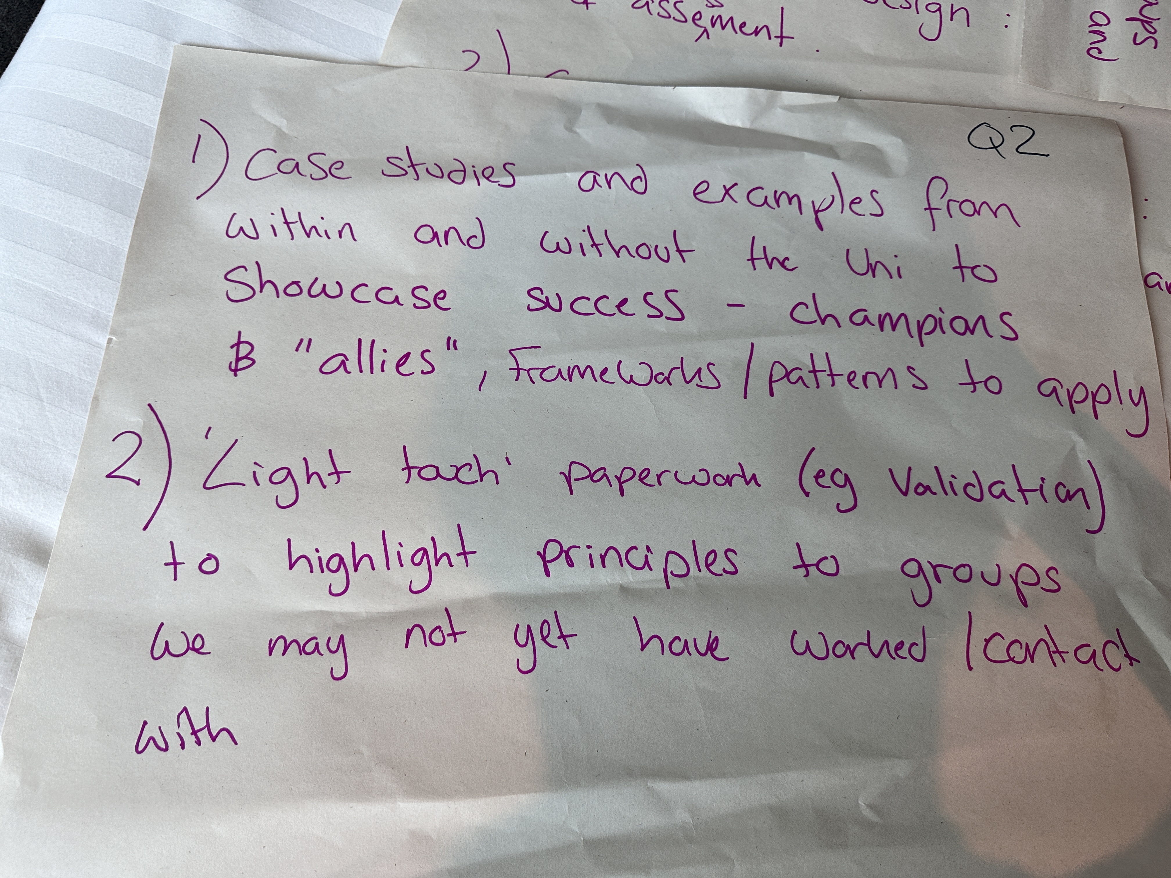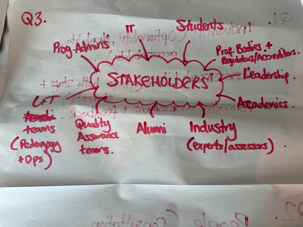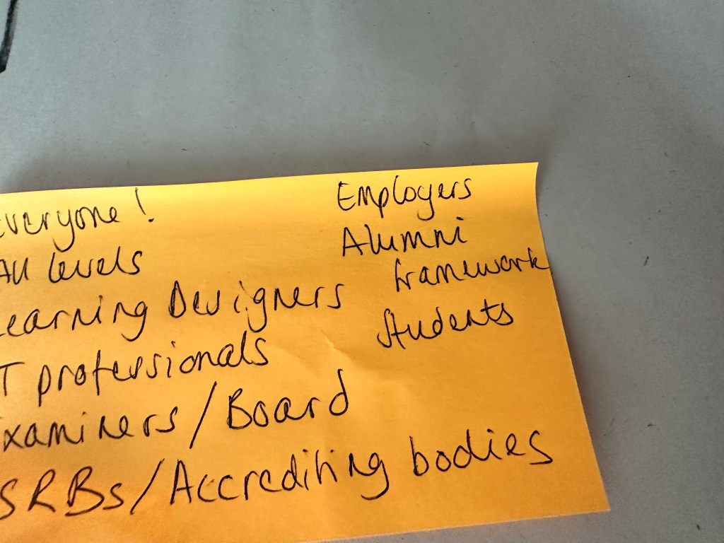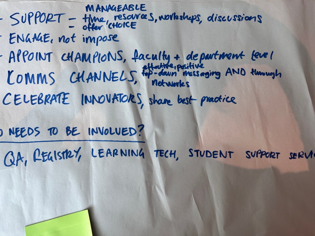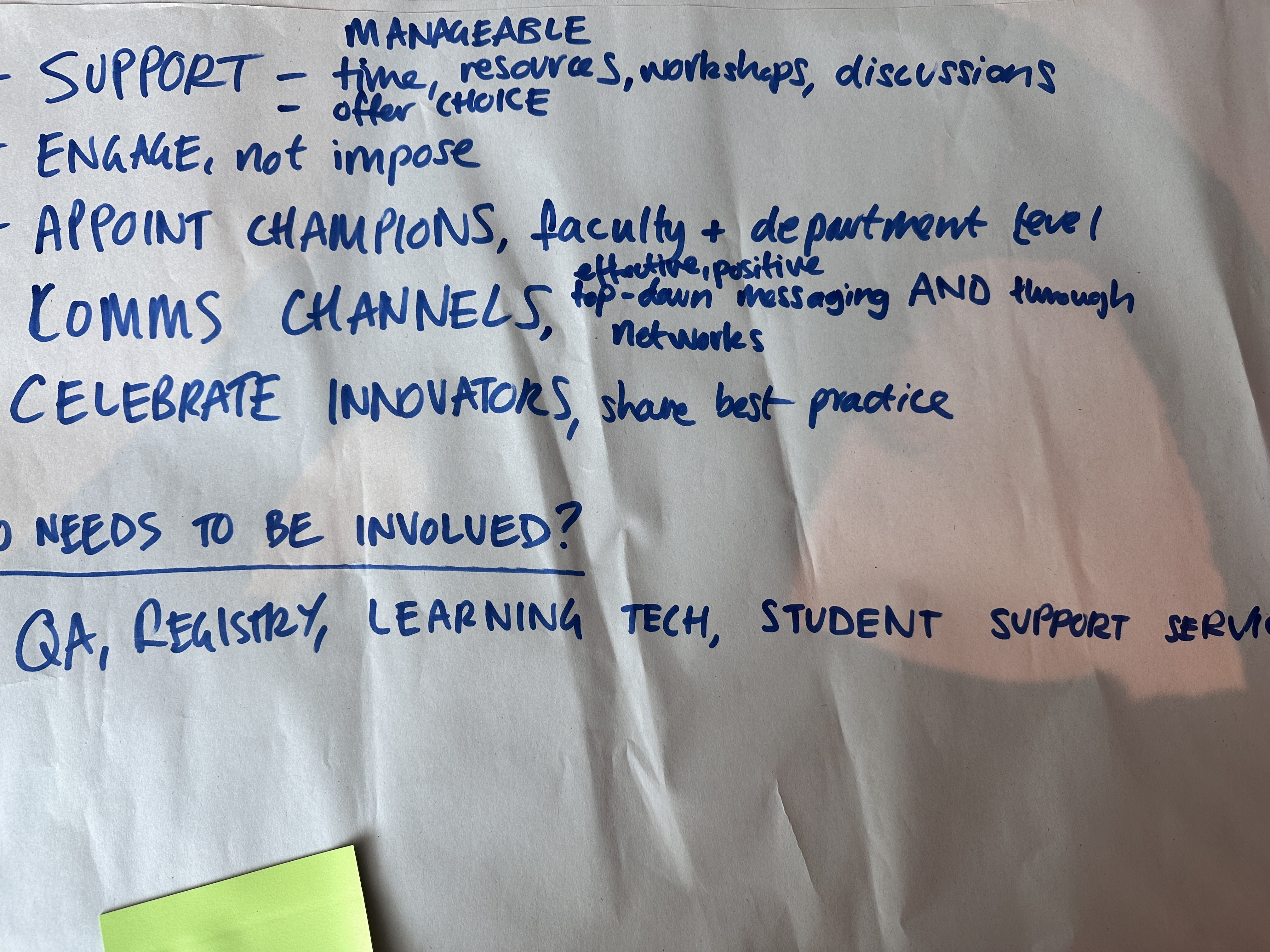 This was a hugely valuable step (well, I thought so!). In the room, we identified how broad the reach of assessment change is and how there is a need to engage so many people and teams —learning technologists, quality experts, senior leaders, library colleagues, accessibility specialists, academic integrity experts, students, student reps or unions, estates teams, professional bodies, external examiners, careers and employability leads, comms and marketing colleagues, inclusion teams, sustainability leaders, employers, alumni… well, everyone!