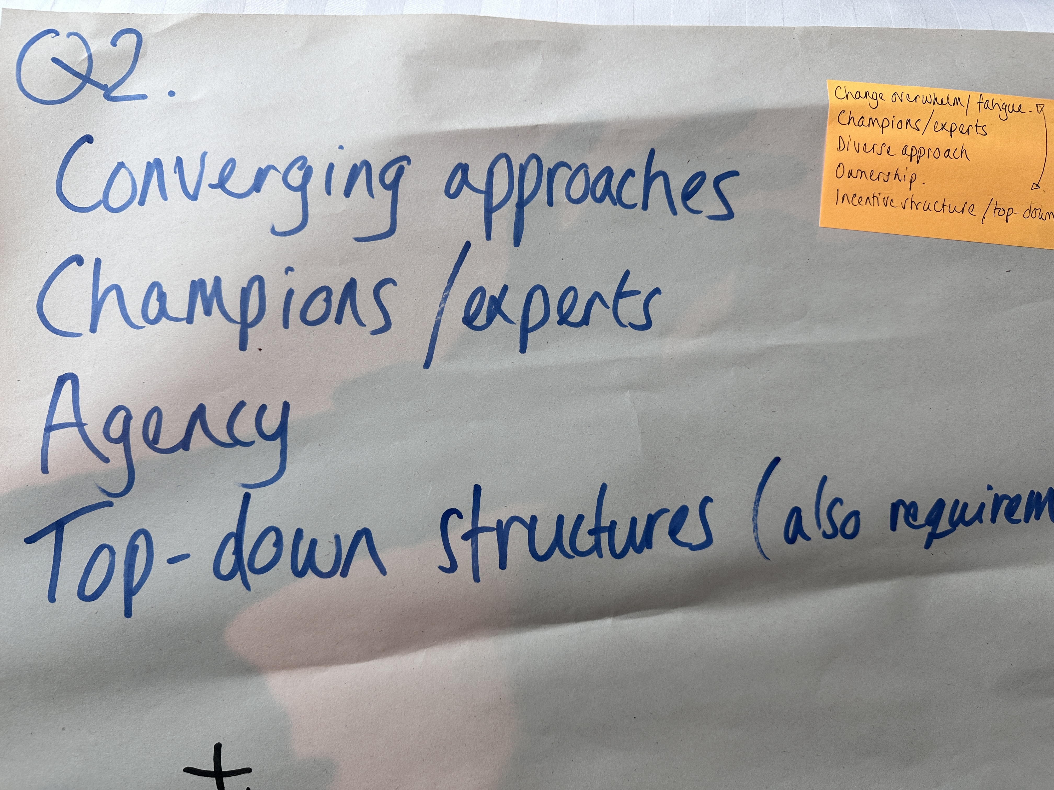 We then set three questions, and each group worked through the process of being a change leader, making choices and exploring the approaches that could be used. I committed to summarising responses, so here is some feedback from the session, by question.