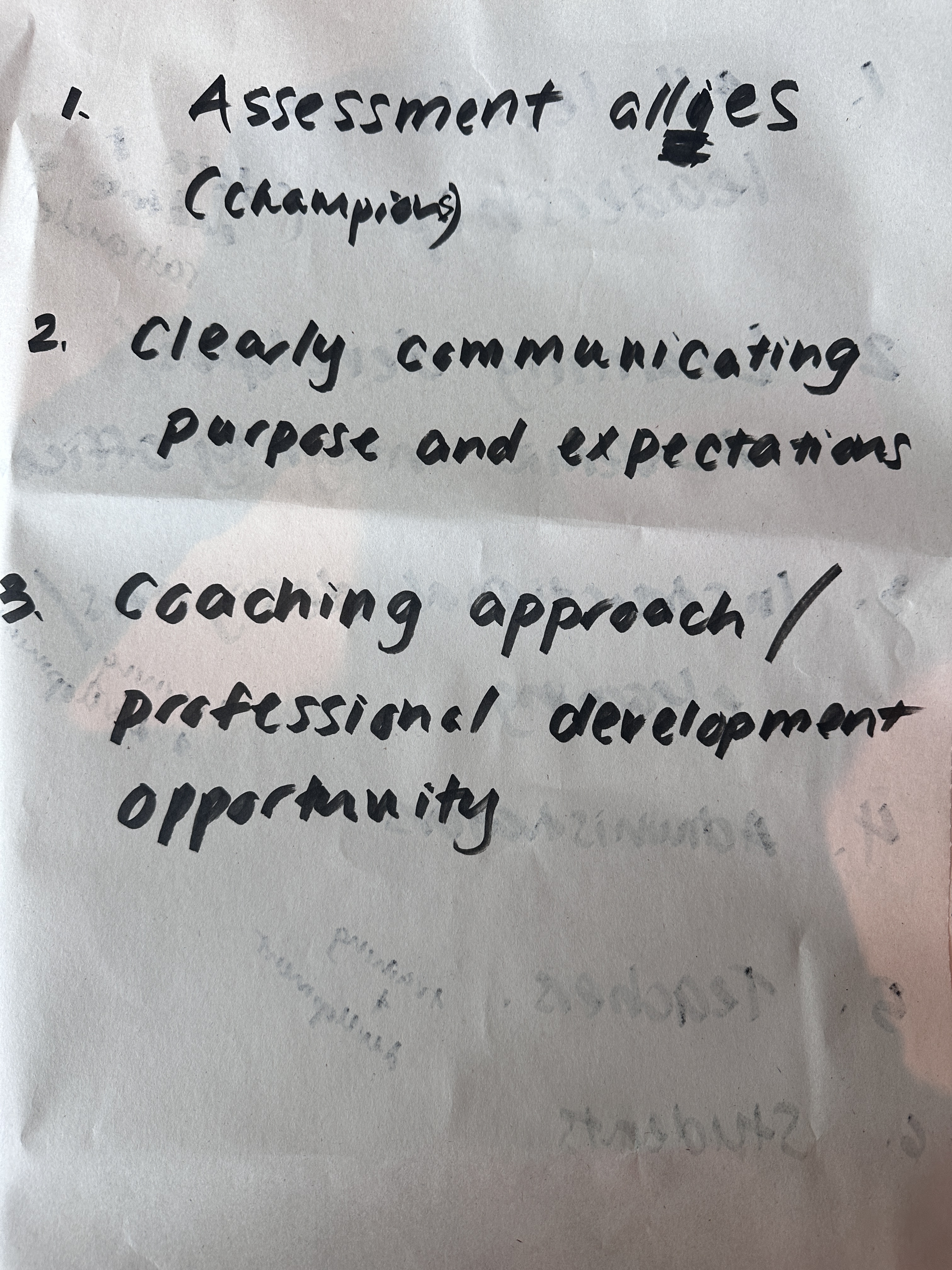 Next, we examined how we would implement change towards the principles we had committed to. We asked what levers and approaches might be used as institutional drivers. Here’s what a room of awesome assessment experts said: